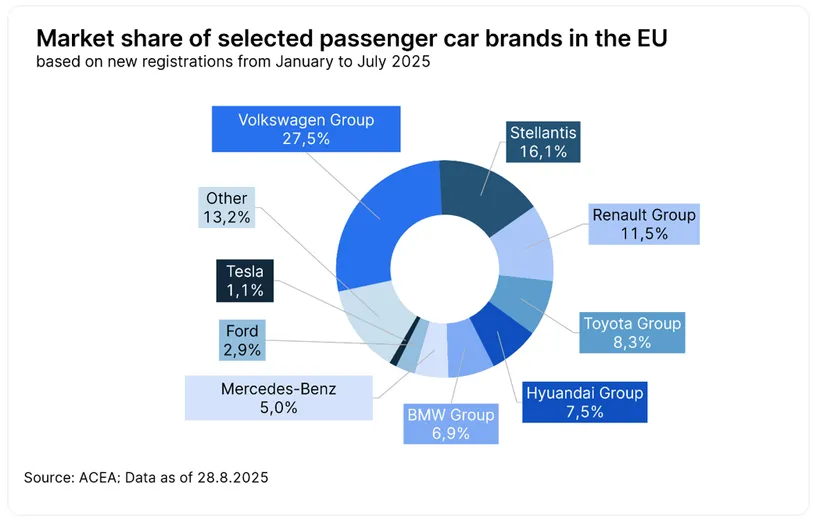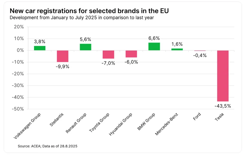 Medzi jednotlivými výrobcami si Volkswagen v prvých siedmich mesiacoch posilnil svoje vedúce postavenie na trhu, keď predal o 3,8 % viac áut. BMW, Mercedes-Benz a Renault takisto predali viac vozidiel. Naopak, materská spoločnosť Opel Stellantis a Tesla zaznamenali pokles, pričom americký priekopník v oblasti elektrických áut hlásil pokles predaja o 43,5 %. Čínsky výrobca elektrických áut BYD predal v prvých siedmich mesiacoch roku 2025 v EÚ približne 58 000 áut. V predchádzajúcom roku to bolo len niečo málo cez 16 000, čo predstavuje nárast predaja o viac ako 250 %.