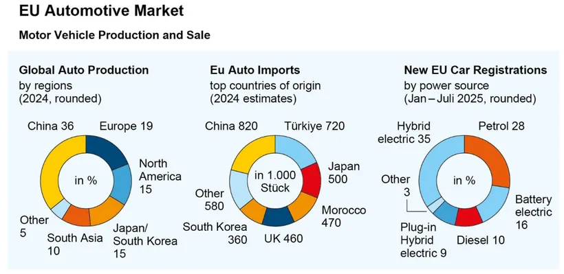 Európsky automobilový priemysel sa v súčasnosti obáva najmä o kľúčové trhy v Číne a USA. V USA čaká výrobcov automobilov a dodávateľov v budúcnosti 15-percentná dovozná daň, čo je šesťnásobok doterajšej sadzby. V Číne majú problémy s predajom Volkswagen, Mercedes-Benz a BMW. Okrem toho čínski výrobcovia automobilov čoraz viac prenikajú na európsky domáci trh.