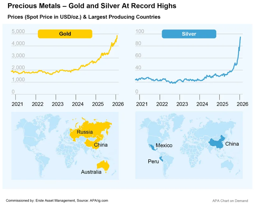 Uprostred rušného týždňa na akciových trhoch ceny zlata a striebra pokračovali v rekordnom raste a dosiahli nové rekordné maximá. Cena trojskej unce zlata v pondelok prvýkrát prekročila hranicu 5000 dolárov, čo znamená, že cena zlata vzrástla od začiatku roka o viac ako 17 percent. Cena striebra prvýkrát prekročila hranicu 100 dolárov. Rekordný rast cien drahých kovov ďalej podporili obavy z kolízie medzi EÚ a USA. Spúšťačom boli hrozby amerického prezidenta Donalda Trumpa zaviesť clá v súvislosti so sporom o Grónsko.