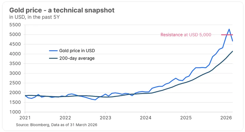 Rast ceny zlata sa v posledných týždňoch zastavil a cena klesla z viac ako 5 260 USD za uncu na 4 100 USD. Hoci odvtedy došlo k oživeniu – zlato sa v súčasnosti obchoduje na úrovni okolo 4 750 USD (k 10. aprílu 2026), od začiatku vojny v Iráne cena klesla približne o 12 % (v USD).