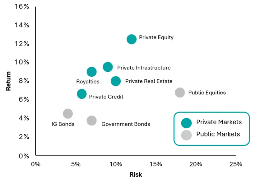 V trhových fázach charakterizovaných zvýšenou volatilitou, oslabujúcou ekonomikou a štrukturálnymi zmenami v globálnej ekonomike nadobúdajú private markets (súkromné trhy) investície čoraz väčší význam – a to tak pre inštitucionálnych, ako aj pre súkromných investorov. Zaradenie private equity (súkromného kapitálu), private credit (súkromných úverov), private infrastructure (súkromnej infraštruktúry) alebo royalties (licenčných poplatkov) už neslúži len na zvýšenie potenciálnych výnosov. Investori naopak čoraz viac vnímajú ďalšie výhody, ako je nižšia citlivosť na hospodárske cykly, stabilnejšie peňažné toky (cash flow) alebo vlastnosti zabezpečujúce ochranu proti inflácii.